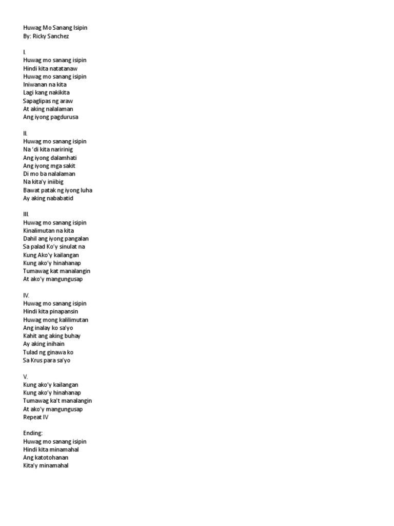 Huwag mo sanang isiping hindi Kita natatanaw Huwag mo sanang isipin iniwanan na Kita Lagi kang nakikita sa paglipas ng araw At Aking nalalaman ang iyong pagdurusa Huwag mo sanang isiping di kita naririnig Ang iyong dalamhati ang iyong mga daing Di mo ba nalalaman na kitay iniibig Bawat patak ng yong luha ay Aking nababatid Huwag mo sanang isiping nalimutan na kita. Sanay lagi mong tatandaan na may pag-ibig na wagas pag-ibig na hindi kumakatawan sa kamalian ng mundo kahit na hindi mo pa ito natatagpuan. Oct 01 2019 Ituloy lang natin ang ating laban.