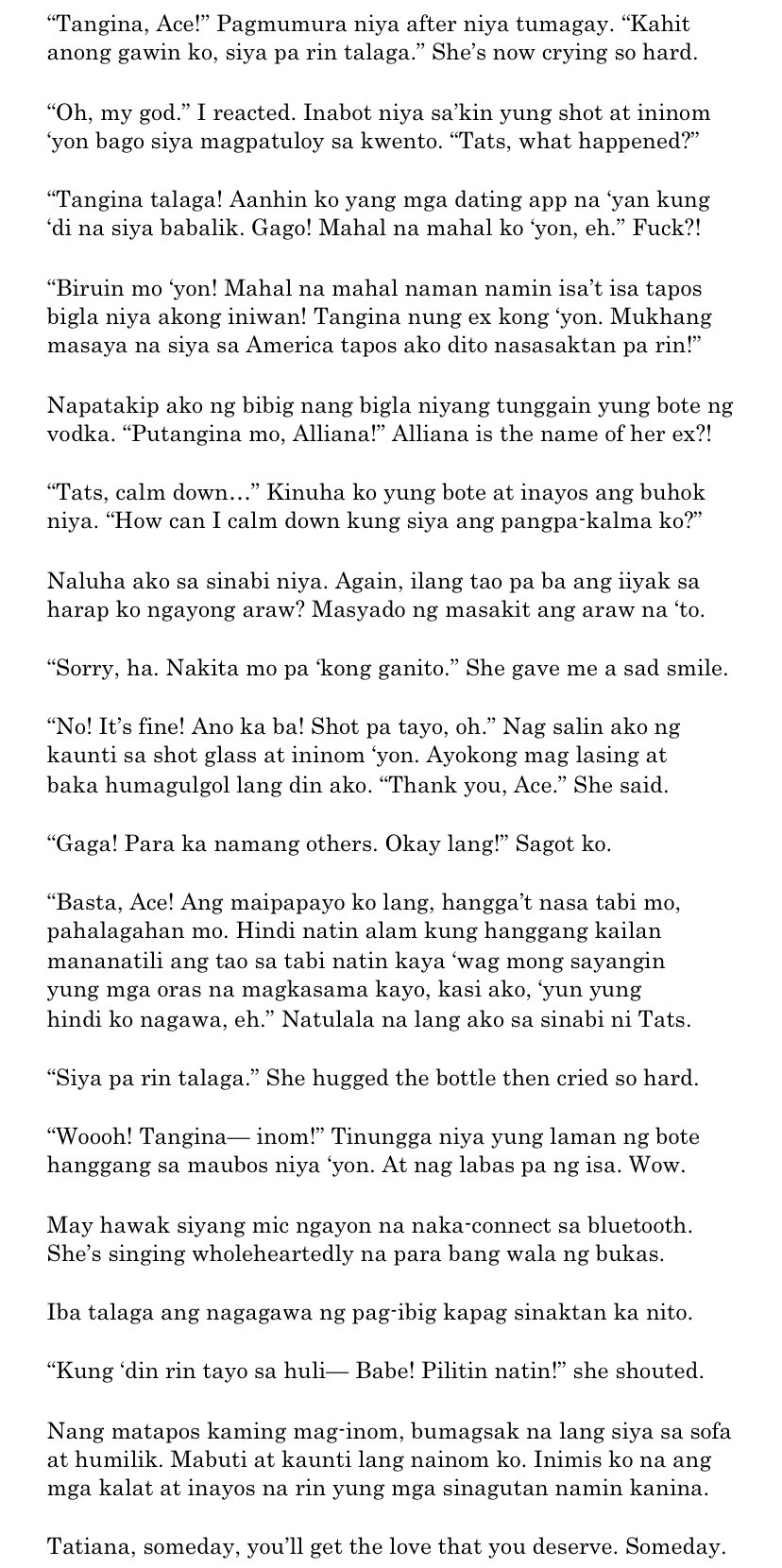 Kung ninais niyang mamatay ang aking anak sanay namatay na. Hindi niya alam kung saan matutulog sa gabing iyon ayaw niyang makahalata ang kanyang mga anak sa tunay niyang damdamin napilitan siyang manatili sa kwarto nilang mag-asawa naligo siya nagpahid ng cream at naglagay ng rollers sa buhok ang mga ito ay ayaw ni Jimmy sa huli kinandado niya ang kwarto. Yung mga akala niya kaibigan pero may pag-nanasa pala sa kanya.