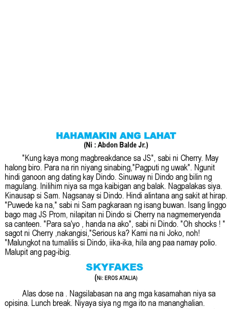 A dagli is a form of literature in Filipino which is usually short and is written with depth sarcasm and satire. Eros Atalia bato-bato sa langit Siglo 20. Feb 28 2019 Taong 2011 naman nang mailathala ang Wag Lang Di Makaraos 100 Dagli Mga Kwentong Pasaway Paaway at Pamatay ni Eros Atalia kung saan ayon sa blogger na si William Rodriguez tinatalakay ang samut saring pangyayari sa lipunan sa paraang madaling unawain dahil simple lang ang paggamit ng wika.